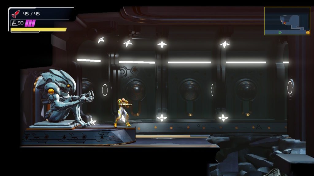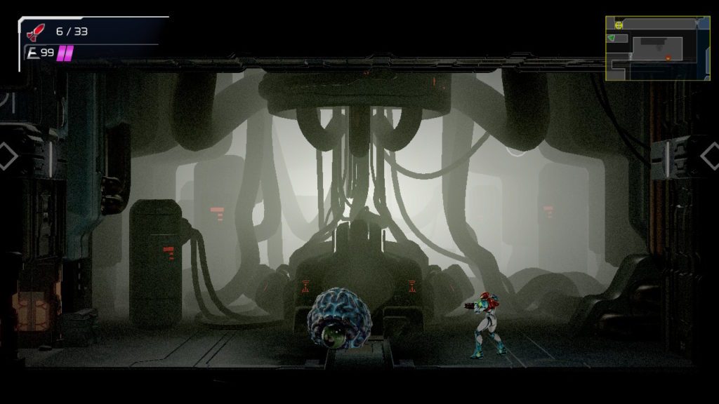 Este Metroid tiene un sistema de juego casi idéntico a Metroid Samus Return y aunque no tiene la posibilidad de ponerlo en 3D como en la Nintendo 3DS, no lo necesitas. El mapeado es espectacular, el efecto 3D brillante y las cinemáticas muy chulas. Tiene algo nuevo y es el poder deslizarte por espacios pequeños, algo que es muy práctico porque hace que te conviertas en morfoesfera de forma automática en los conductos y también puedes pasar por debajo de los enemigos.