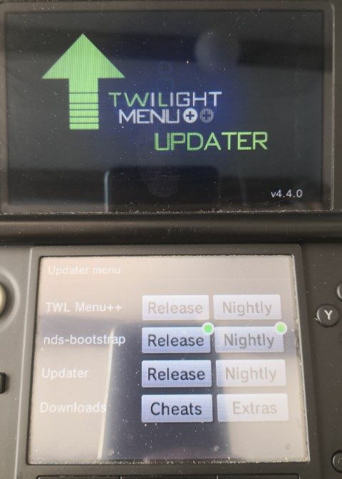 Es recomendable, en la opción «Updater» dar a «Release» y confirmar con A, ya que, si no, el siguiente paso puede no funcionar. Cuando termine, aproximadamente después de 1 minuto, le daremos a B para ir hacia atrás y se reinicia la aplicación.